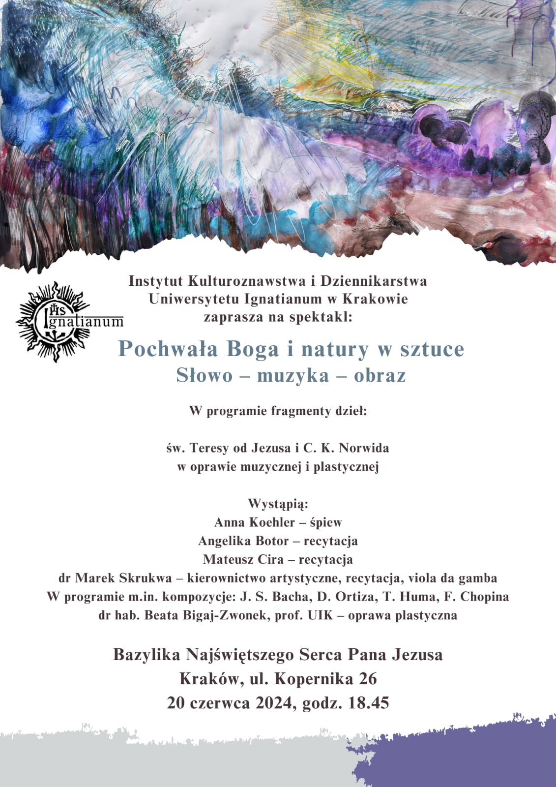 Instytut Kulturoznawstwa i Dziennikarstwa Uniwersytetu Igantianum w Krakowie zapraszam na spektakl. W programie fragmenty dzieł Św. Teresy do Jezusa i C. K. Norwida w oprawie muzycznej i plastycznej. Wystąpią:: Anna Koehler - śpiew, Angelika Botor - recytacja, Mateusz Cira -recytacja. Spektakl odbędzie się 20 czerwca o godz. 18:45 w Bazylice Najświętszego Serca Pana Jezusa w Krakowie, przy ul. Kopernika 26. Zapraszamy. więcej